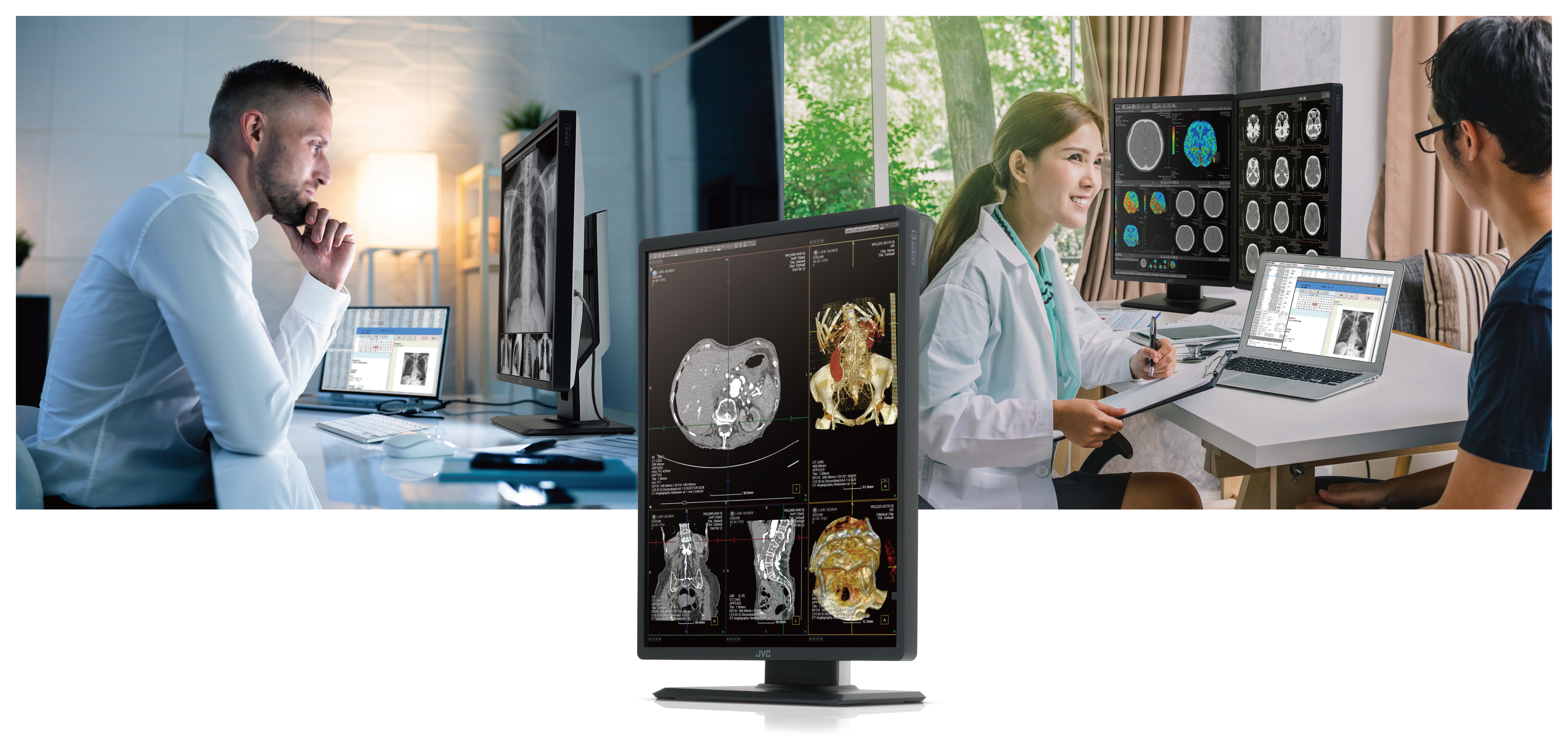 新製品の21.3型300万画素カラー液晶モニター「CL-S301」を展示。本機はUSB Type-Cケーブル1本で、映像伝送とノートPC給電の両方が可能。また、KVMスイッチを搭載し、2系統入力にも対応することにより、1台のキーボードとマウスで2つのPC端末の入力切り替えが可能。ノートPCとのスマートな接続やすっきりとした配線で自宅でも簡単に快適な画像診断環境を構築することができ、加えて設備費用の削減にも貢献する。大規模な病院はもちろんクリニックなど、業務効率化や働き方改革をサポートする新型モデルとして提案する。
