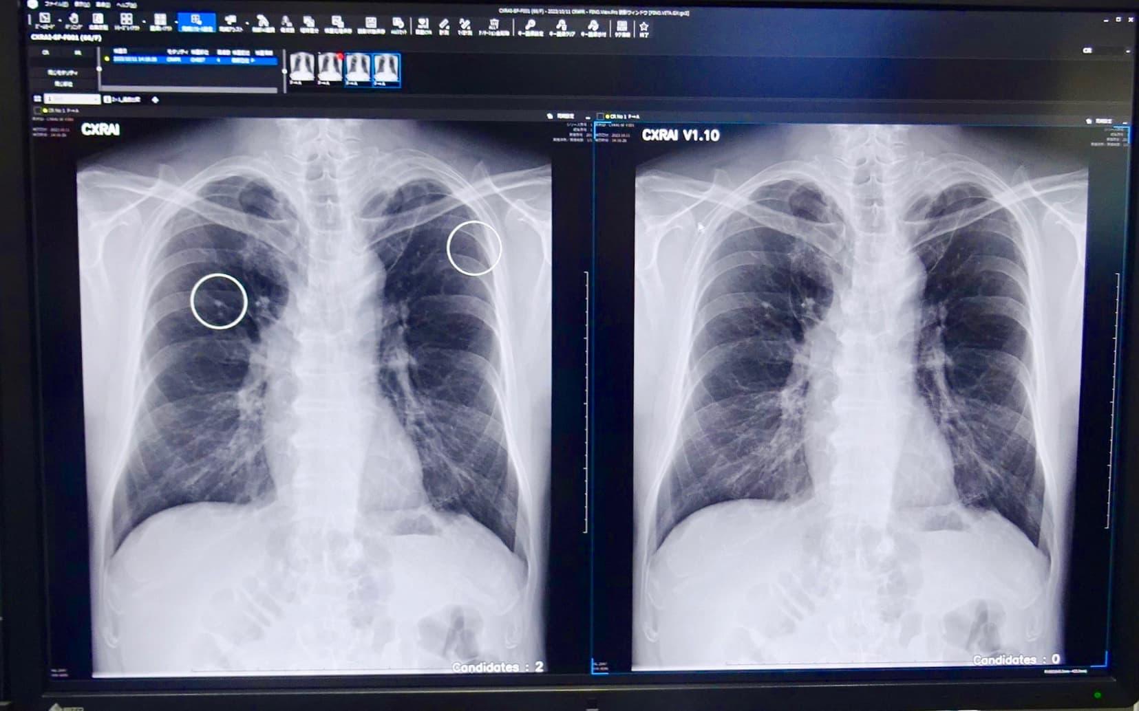 FINO.VITA.GXは胸部X画像診断支援AI「CXR Finding-i」と連携が可能。正常例に対して新バージョンで特異度が向上した症例。