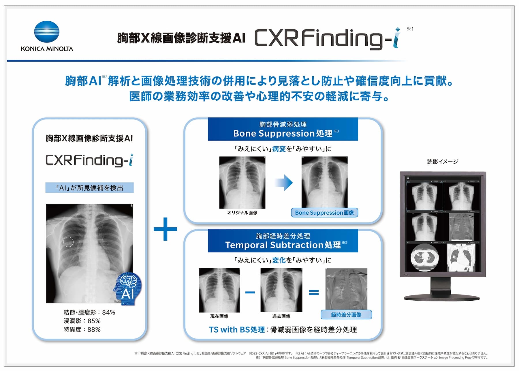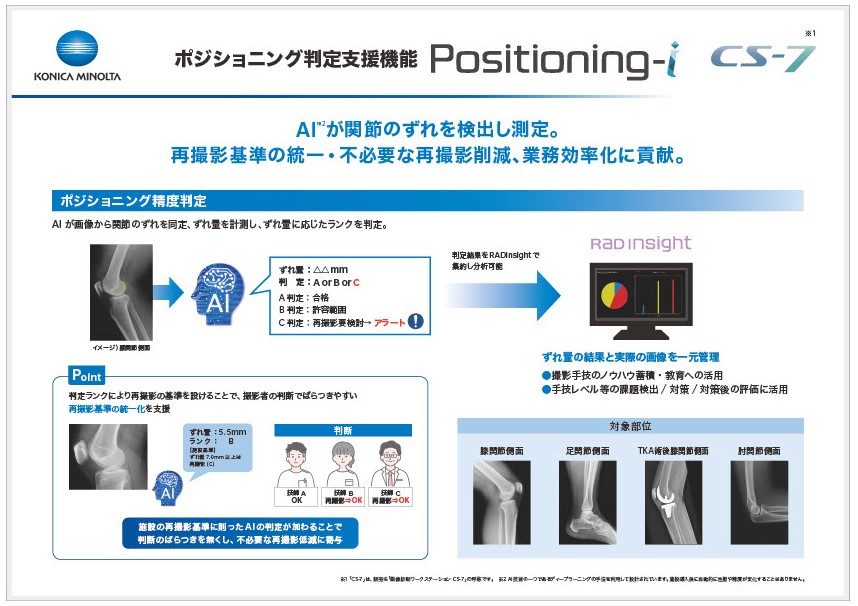 ヘルスケアAIでは、AIブランド「FORXAI」の下で展開する画像診断AIや業務支援AIなどの技術が展示された。FORXAIとは、「先見性:Foresight」と「AIを社会のために:For X AI」が変革を意味する「X」での重なり合いを表現している。「CXR Finding-i」は胸部X線画像診断支援AI。肺がんが疑われる結節影・腫瘤影、肺炎や結核などの所見である浸潤影の見落とし防止をサポート。「Positioning-i」はポジショニング判定支援AI。ポジショニングのポイントとなる部分のずれ量を検出し、再撮影判断を支援する。施設様でずれ量の数値を「A 良好、B 許容、C 再撮影の検討が必要」と予め設定することができる。「C 再撮影の検討が必要」と判定された場合は医師の診断に適さない可能性があるので、再撮影のアラートが表示される。