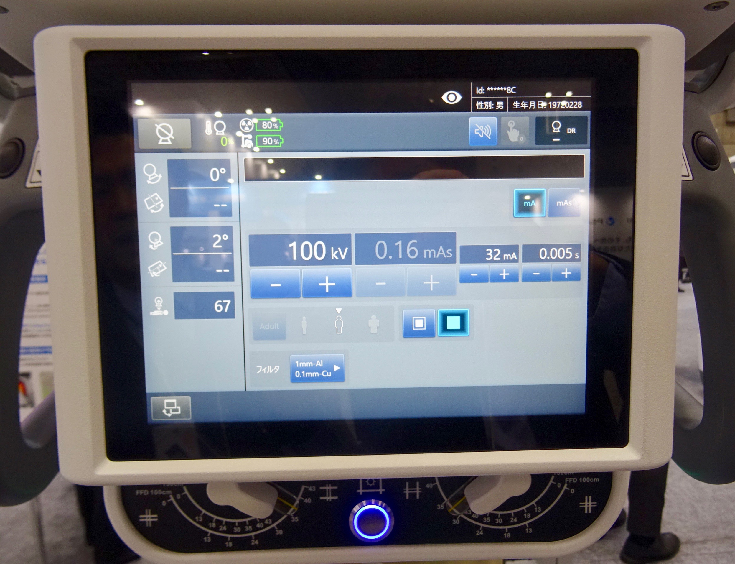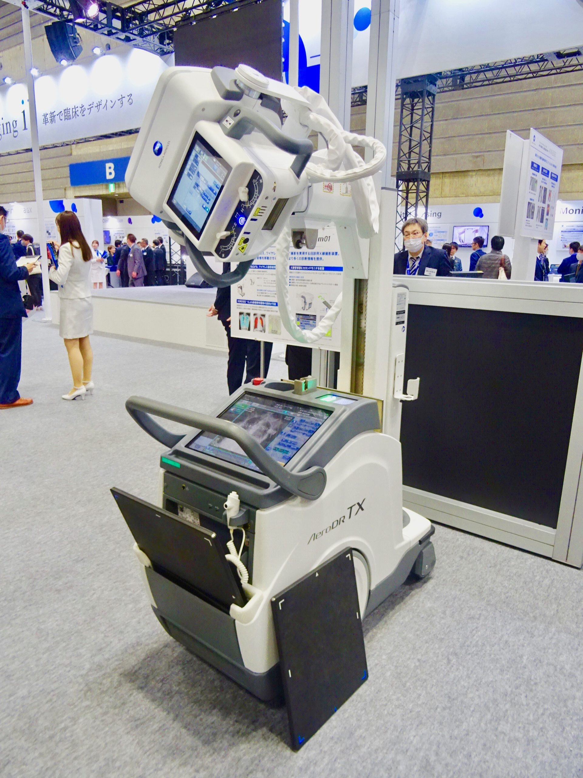 「AeroDR TX m01」は従来の静止画に加え、パルスX線によりX線動態画像を撮像できる同社の自信作だ。今回バージョンアップされ、管球にはセカンドモニターが19インチタッチモ二ターに大型化され、アライメントサポート機能など撮影支援機能も進化している。