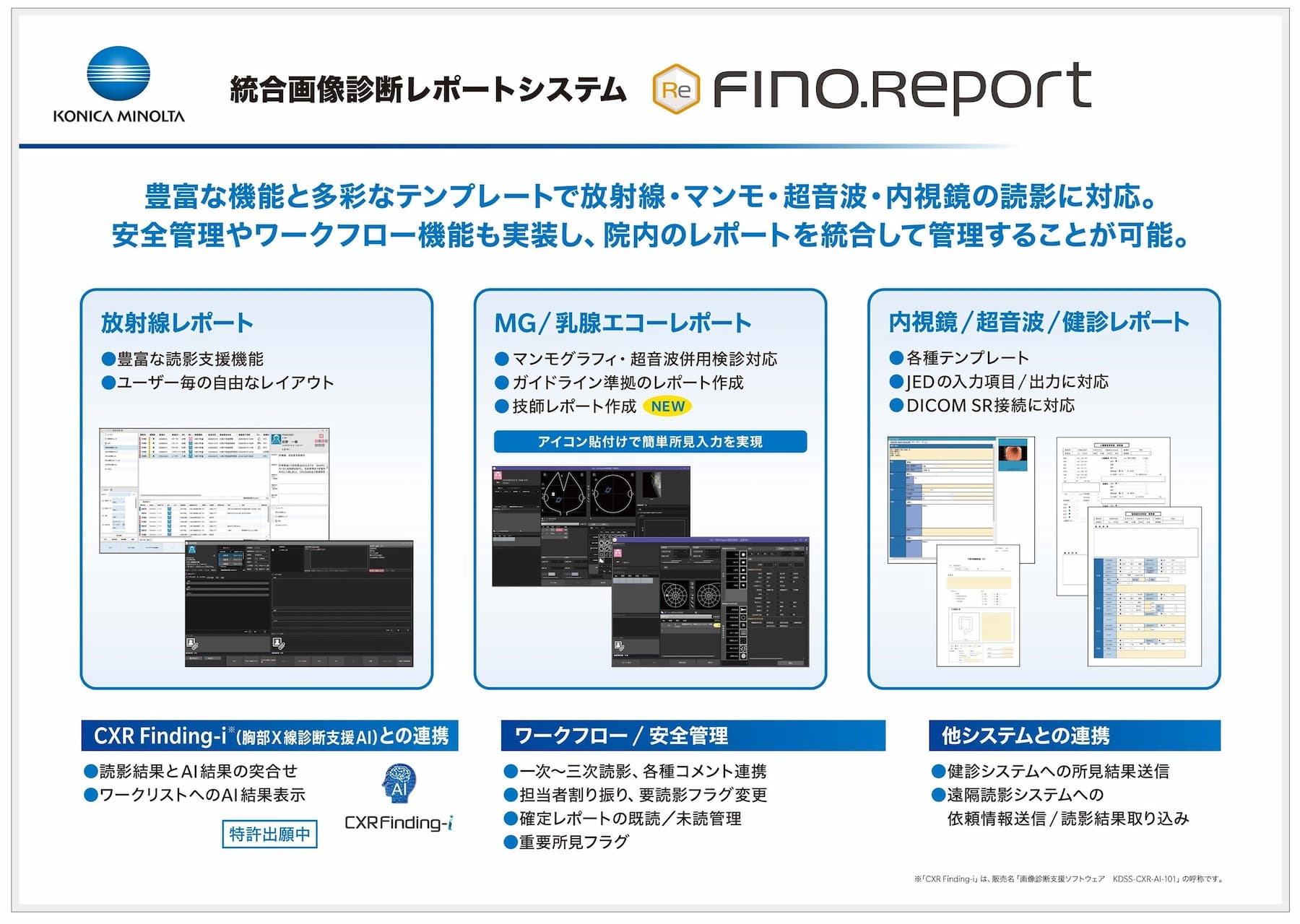 医用画像管理システム『FINO.VITA.GX』は胸部/腹部CT同期位置アシスト機能や、解析精度を高めた胸部AI機能が搭載、読影におけるさらなる操作性向上を実現した。放射線、マンモグラフィ、内視鏡、超音波と幅広い対応が可能なレポートシステム『FINO.REPORTは、過去レポートとの比較・引用や定型文等の記入支援、各種検査に応じた多彩なテンプレートを実装。さらにAI判定と読影結果を突き合わせる機能を搭載し、精度の高い読影をサポートする。