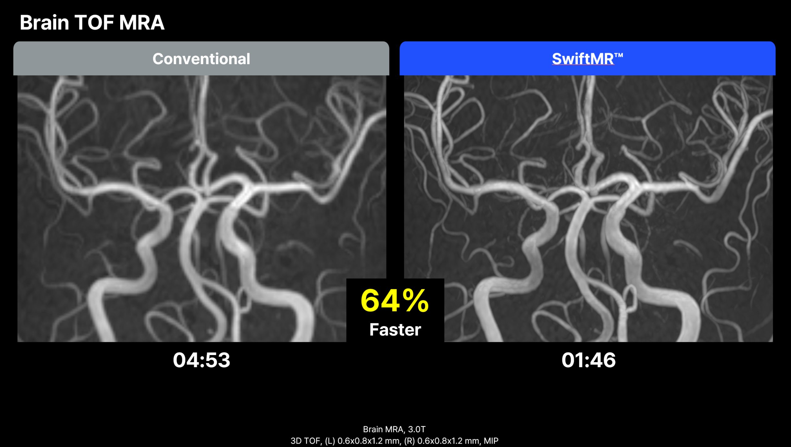 SwiftMRは、既存のMRI装置のソフトウエアやハードウエアのアップグレードなしにMRI画像のノイズ低減および超解像技術を搭載した最新のソリューションである。AIモデルが300万枚の画像データを学習し、ノイズを除去しながら組織信号を高解像化することで、高SNRかつ高解像度の画像を提供し、撮像時間の短縮を実現する。DICOM画像を処理するアルゴリズムを採用し、既存のMRI装置やPACSとDICOM接続することで、クラウドサーバー上でAI画像処理を行う。