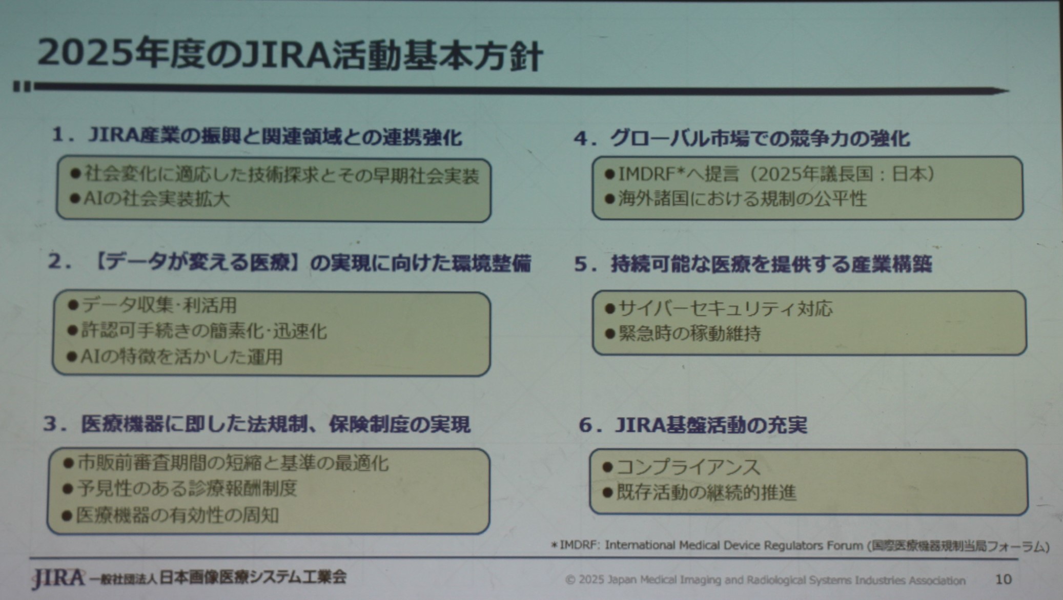 「活動基本方針」では、2024年に発表の「画像医療システムビジョン 2030」に対応した「2025年度JIRA活動基本方針」が発表された。具体的には「JIRA産業の振興と関連領域との連携強化」「【データが変える医療】の実現に向けた環境整備」「医療機器に即した法規制、保険制度の実現」「グローバル市場での競争力の強化」「持続可能な医療を提供する産業構築」「JIRA基盤活動の充実」の6方針。
