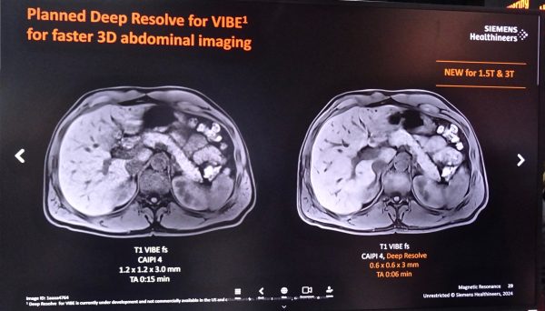 今回新たに、これらDeep Resolveが3Dに対しても対応可能となった。3DにおけるパラレルイメージングにCAIPIRINHAがあるが、Deep Resolveは新たにCAIPIRINHAの高速化技術を学習し、3D撮像のさらなる高速化が可能となる。さらに超解像技術であるDeep Resolve Sharpは3D撮像においては面内の超解像効果だけではなく、スライス方向の超解像機能も有している。
