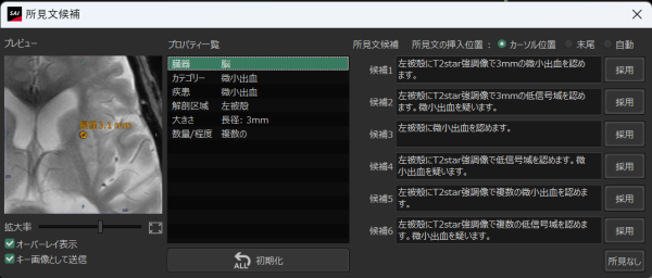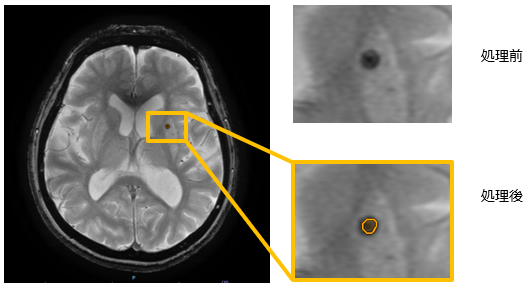 一般的に、頭部T2強調画像で低信号となる領域は出血であることが多く、本機能により微小出血の診断支援に繋がることが期待される。今回拡充する「脳区域ラベリング(MR)」機能の解剖情報を反映した所見文候補作成支援機能と併用することで、読影ワークフロー全体を支援する。
