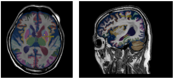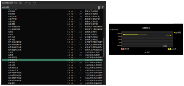 また、ラベリングした各領域の体積を算出・表示することも可能で、指定した脳領域の経時変化をグラフ表示することも可能である。