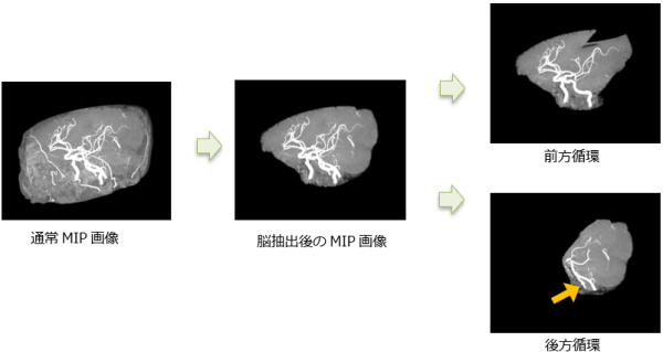 今回、MRA画像において血管観察を容易にする「MRA脳抽出」機能を搭載した。血管観察において不要領域(眼球・顔の筋肉)を削除したVRまたはMIPを表示することができる。また、前方循環/後方循環の領域のみに限定した表示も可能である。