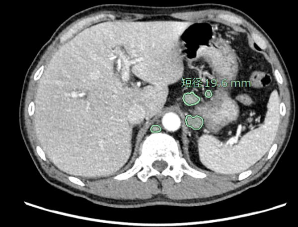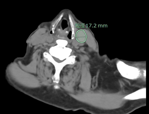 リンパ節は全身に存在しており、想定外の箇所が腫大することもあるため、読影に大きな負担がかかっている。従来、CT画像(造影・非造影)において、縦隔・腋窩リンパ節の抽出が可能だったが、今回、頸部・腹部(大動脈周囲、骨盤部)でもリンパ節の抽出ができるように対象範囲を拡充した。縦隔・腋窩だけではなく、頸部・腹部も含めた箇所における腫大傾向のリンパ節を拾い上げ、自動で短径計測を行う。癌の転移検索の支援に繋がることが期待される。