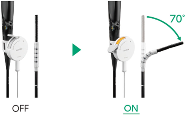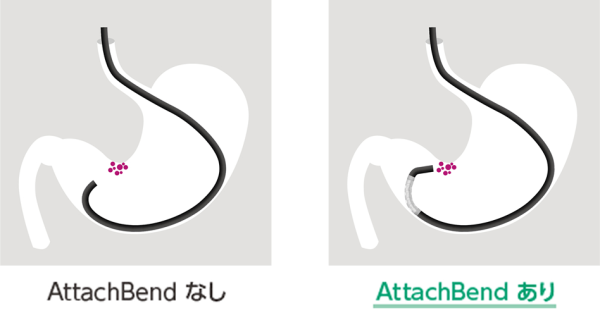 「AttachBend」を「EG-840TP」の軟性部に装着し、専用操作部のレバーを押下することで、装着部を最大70°までわん曲させることができる。また「AttachBend」の装着方向に応じて、任意の方向にわん曲させることが可能である。これにより、従来スコープが届きにくかった病変に対して、角度の調整や距離の確保がしやすくなり、「EG-840TP」による処置性能の向上が期待できる。