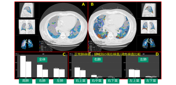 A:過去の検査画像、B:現在の検査画像、C:過去と現在の検査画像における正常肺(両肺、右肺、左肺)の体積を比較したグラフ、D:過去と現在の検査画像における領域別の体積を比較したグラフ。