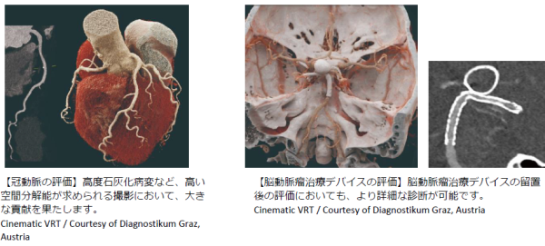 「NAEOTOM Alpha.Peak」および「NAEOTOM Alpha.Pro」が持つ高い時間分解能は、血管系の描出、動脈瘤の詳細な解析、動脈解離の評価などにおいて高い評価をいただくだけでなく、特に高度石灰化冠動脈を有する心疾患患者さんの診断・治療において、侵襲的なカテーテル検査に代わるものとして、患者さんの身体的負荷軽減や、診断から治療までに要する時間の軽減への貢献が期待されている。