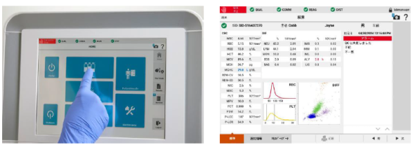 本体側面のビルドイン・タッチスクリーンは、機能ごとに色を揃えた表示や大きな操作ボタンなどの直感的な操作が可能なインターフェースを採用し、検査の効率化に貢献する。また異常値を把握しやすいスキャッタグラムにより異常値の見逃し低減に貢献する。難しいトレーニングが不要で、検査の標準化に繋がる。