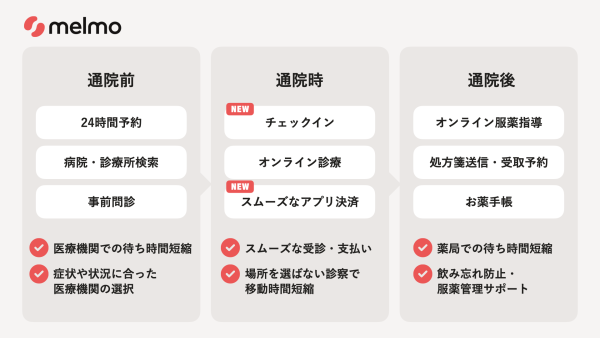 melmoは、対象医療機関の予約から問診、受付、オンライン診療、決済まで、普段の診療がスマホひとつでより便利になるアプリである。通院前から通院後に至る一連の流れにおいて、よりスムーズな医療体験を実現し、患者・生活者が抱える不便さを解消していく(下図参照)。