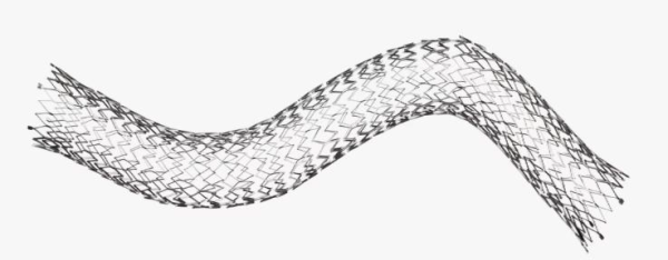左:VEVOVO™ 静脈ステントシステム。オープンセルのステントデザインにより、拡張力を維持しながらも蛇行した血管に追従する柔軟性を担保