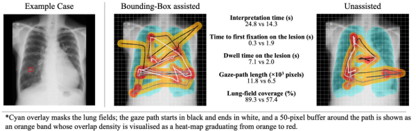 バウンディングボックスがある場合、放射線科医の読影時間は平均して延長し、病変部位を注視している時間や視線の移動距離、肺野全体をカバーする割合も増加した。一方で、病変に最初に視線が向かうまでの時間は短縮されており、AI表示が注意の誘導に影響していることが示された。