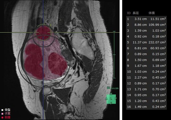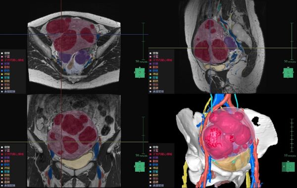 子宮筋腫は、成人女性の罹患率が20~30%と高頻度に見られる疾患で、機能温存が重要とされている。MRIや超音波画像診断装置の2D画像では筋腫や周囲組織の3次元的な把握が難しく、骨盤内の複雑な解剖構造の理解も困難である。また、筋腫の大きさや数、妊孕性温存の希望などにより様々な手技が適用されるが、筋腫の計測や手技の選択は各医師の経験則や感覚に基づいて行われているという課題がある。「婦人科臓器解析」ではMRIのT2画像からAI技術を活用した抽出エンジンを用いて子宮周囲の臓器をセグメンテーションし、ユーザーが子宮筋腫と判断した箇所の体積・数・深さの定量化を行うことができる。また、3Dで周辺組織との位置関係を把握することで筋腫手術の低侵襲化や取り残し防止等への寄与が期待される。