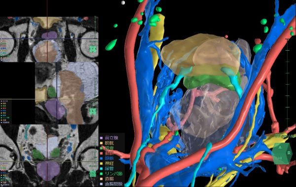 術前のCT画像やMR画像から3D構築を行うことで、骨盤腔内の膀胱周辺臓器や神経、血管の位置関係を把握し、患者ごとに異なる血管走行などの解剖学的特徴を把握し、手術シミュレーションを行うことができる。