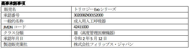 このたびフィリップスでは、新型コロナウイルス感染症に対応が可能な人工呼吸器「トリロジーEvoシリーズ(トリロジー・エボ・シリーズ)」が、厚生労働省および独立行政法人医薬品医療機器総合機構(PMDA)において非常事態への対策として、薬事承認手続きを優先して迅速にご対応いただきました結果、5月12日(火)付けで薬事承認を取得し、日本への導入が決定しましたのでお知らせする。導入にあたって、まずは早期に数百台規模の国内入荷の調整を開始し、年内中には千台規模の入荷を目指す。なお、本製品はフィリップスのフラッグシップモデルであるトリロジーシリーズの後継モデルとして、米国をはじめとするその他諸国において、すでに数万台規模で導入されている。