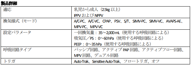 体重2.5kg 以上の乳児から成人まで幅広い年齢の患者の治療を可能にする。また、デュアル回路や小児用回路も使用可能で、回路コンプライアンスや回路抵抗の補正を行う機能を搭載している。本製品は医療施設および在宅での使用に適した設計で、さまざまな場面や環境に対応する。