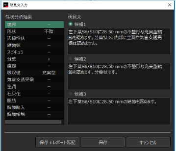 肺結節の性状を分析して結果を表示するとともに、対象の所見文候補を提示する機能。医師が所見を書く作業をサポート。