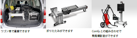 折りたたみや組み立ても簡単。キャスター付きで楽々搬入ができる。また35kgという軽量設計なので階段でも大人2名で十分運搬可能である。積載性にもこだわり、Comfyを含めた撮影機材一式及び2名乗車をミニバンではなく5ナンバーワゴン車で実現した。