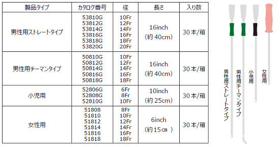 ⚫豊富な形状・サイズ男性用、女性用で異なる形状をご用意。男児用もあり、体に合わせて径や長さをお選びいただける。ピッタリなサイズを選ぶことでカテーテルを挿入する痛みが低減でき、排尿を適切に行うことが可能。