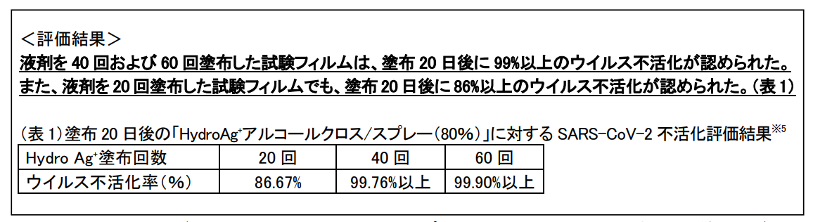 試験フィルムの液剤を塗布した面に、SARS-CoV-2液を滴下し、その上に無加工のフィルムを被せて密着させ、室温で24時間静置。その後、SARS-CoV-2液を回収し、感染力を持つウイルス料の指標であるウイルス力価(りきか)※3を算出。試験フィルムに滴下したSARS-CoV-2液※4と、試験フィルムに滴下せずに室温で24時間静置したSARS-CoV-2液のウイルス力価を比較し、「Hydro AG+(ハイドロエージープラス)アルコールクロス/スプレー(80%)」の液剤を塗布した試験フィルムのウイルス不活化を評価した。