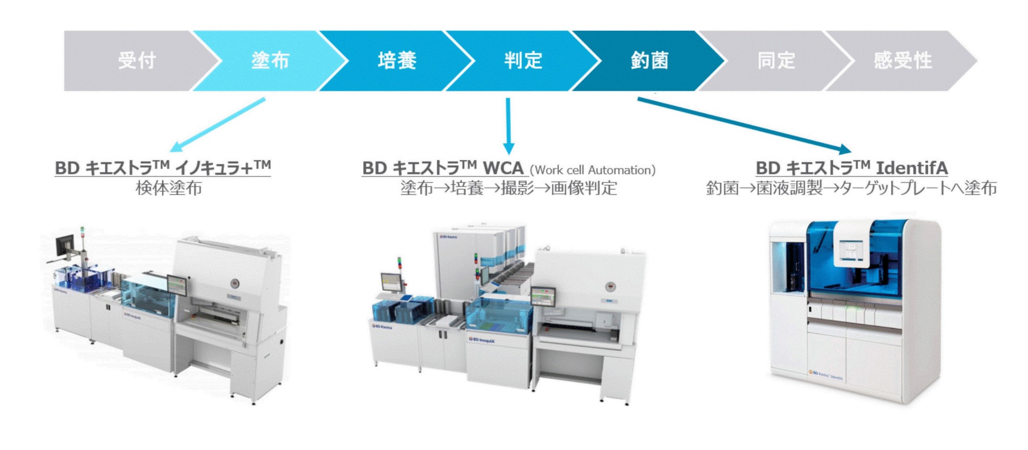 「BDキエストラ™ IdentifA」は、システムと連携して臨床検査技師が選択したコロニーの座標情報を読み取り、装置内のピペットで適切に釣菌し菌液調製を行う。ロボットアームがその菌液をターゲットプレートに均等に塗布し、必要な試薬を加えるといった微生物の同定検査の一連の前処理工程を全自動で行う装置である。BDキエストラ™ ソリューションには、培地への検体の塗布を自動化する「BDキエストラ™ イノキュラ+™」や、培養過程を定期的に撮影し、培養状態を判定できる撮影機能付きふらん器「BDキエストラ™ リーダコンパクト」があり、これらを連結することで、微生物検査ワークフローの自動化とデジタル化を実現する。