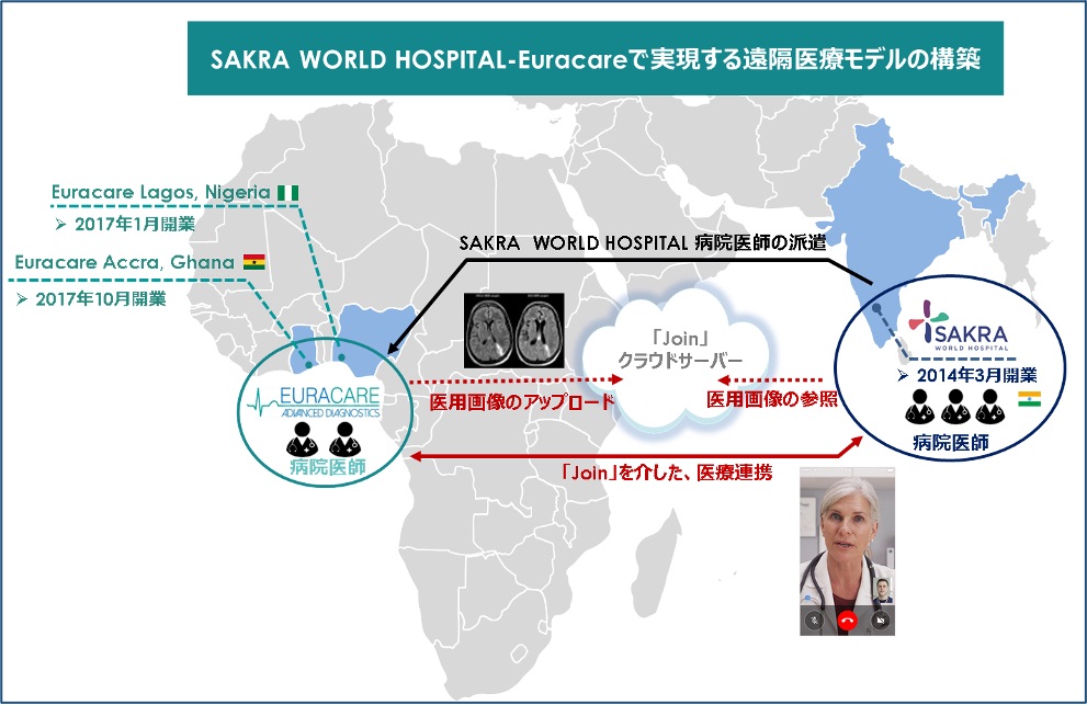 豊田通商がインドで運営するSAKRA WORLD HOSPITALと、豊田通商グループのCFAO SASの子会社がアフリカのガーナ・ナイジェリアで運営するクリニックEuracareを「Join」でつなぎ、両施設の専門的知見の交換による医療サービスの向上、遠隔診療を実施する。