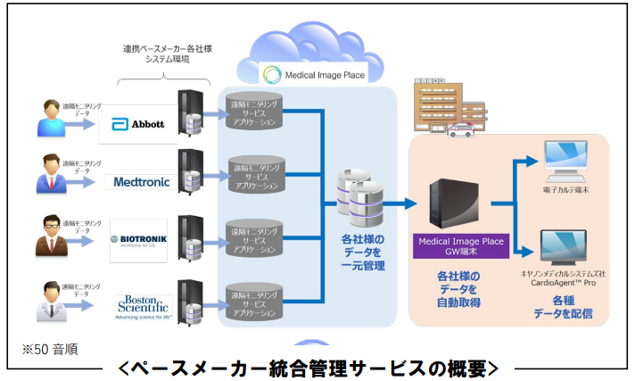 キヤノンメディカルシステムズ株式会社(以下キヤノンメディカル)とキヤノン ITS メディカル株式会社(以下キヤノンIM)は、「ペースメーカー統合管 理サービス」の提供を本日より開始する。「ペースメーカー統合管理サービス」はペースメーカー各社が提供する遠隔モニタリングサービスの受信データを一元管理できるクラウドサービスだ。各社の異なる受信データを統 一して管理・表示することで、簡単かつ迅速に患者さんの状態を確認でき、医療従事者によるモニタリング業務の負荷軽減と効率化を図り、質の高い医療サービスの提供を支援する。