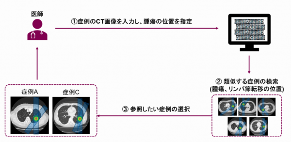 今回、共同開発する検索システムは、NSCLC における過去の CRT 症例を収載し、医師の治療計画の参考となる情報を提供する。医師が CRT 症例の CT 画像を検索システムに入力し腫瘍の位置を指定すると、システムに収載されている過去の症例の中から、症例画像と腫瘍の位置が類似した症例を検索できる。医師は検索結果として表示された類似症例の中から、参照したい症例を選択し、治療計画情報を表示させることができる。