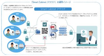 「Smart Cabinet クラウド」は、e-文書法に対応した医療関係文書のデジタル化、共有、管理を実現する総合ソリューションである。 「Smart Cabinet クラウド」を利用すると、日々発生する医療系文書をその場でスキャンして電子化し、専用クラウドサービスで安全に共有と管理を行える。地域医療の連携、患者情報の共有を実現しながら、紙の書類の保管スペースのコストを削減。また、病院の業務のフローに沿った登録機能、使いやすい画像管理機能や閲覧・検索機能により、電子カルテと連動した効率的な活用が可能になった。 また、単にスキャンによる電子化データのみではなく、電子カルテシステムの記事情報や、看護記録、部門システムの紹介状、退院サマリ、各記録をPDF形式に生成して登録・管理することにより、従来困難であった非構造化データ情報の一元管理が行えるようになった。