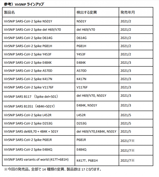 ロシュ・ダイアグノスティックス㈱は、新型コロナウイルスの変異を検出する研究用試薬「VirSNiP」シリーズの新製品を 7 月 15日に発売。デルタ株などに見られる P681R と E484Q という変異を検出する試薬と、K417T とP681H の二つの変異を組み合わせて検出し、懸念される変異株(VOCs; Variant of Concern)*に位置づけられている四つの変異株を判別できる試薬を含む 3 製品を発売。
