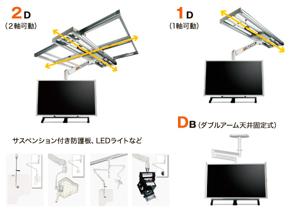 天井にレールを配した可動式、天井に直付けの固定式の2種類の製品タイプがある。