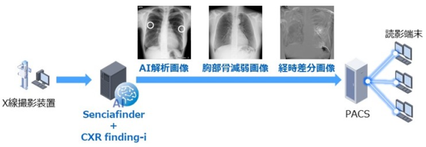 「CXR finding-i」は、画像処理ゲートウェイ「Senciafinder」を介して他社製のPACS(医用画像管理システム)とも接続が可能です。そのため汎用性が高く、より多くの医療現場において医師の負担軽減に寄与します。