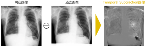 胸部画像の現在と過去の差分画像を生成する画像処理技術で、経時的な変化の有無を可視化します。治療中の病変の大きさの変化や治療後の経過観察など、1枚の画像により一目で過去と現在のちがいを確認できることで、診断精度の向上と時間短縮が期待できます。