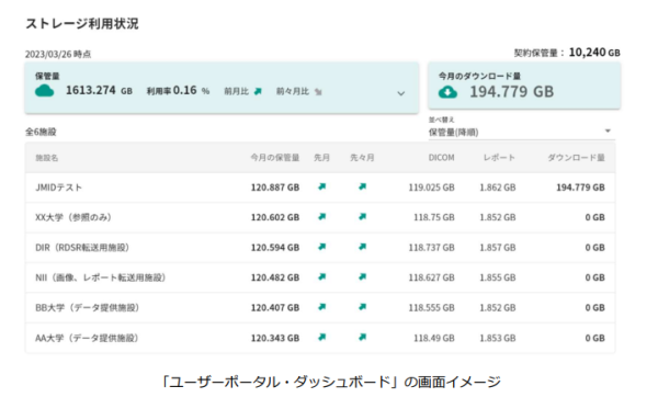 ・ データベース上に登録された大量の医用画像や、所見などを含むレポート情報がどのように活用されているかを管理画面上でモニターできる。 J-MID を利用する各施設からアップロードされた画像やレポート情報のデータ容量や、ダウンロードされた容量を参照し、各施設での活用状況を把握することができる。