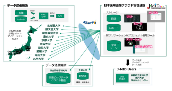 J-MID は、日本医学放射線学会が、2018 年に、日本医療研究開発機構(AMED)の支援を受けて稼働させた、国内の医療機関で撮影された医用画像を集約し一元管理するデータベースである。JRS は、J-MID の活用を通して、画像診断支援 AI 技術をはじめ、画像診断の精度向上や効率化を支援する技術のほか、画像診断装置やシステムの適正使用、画像標準化、被ばく管理など、放射線医療の向上に向けた研究開発を推進する。2019年より順天堂大学(大学院医学研究科放射線診断学 教授:青木茂樹)が研究代表施設として J-MID を活用した研究開発をリードしている。現在、データ提供施設として国内計 10 施設、共同研究施設として国内計 14 施設が J-MID に参画する。